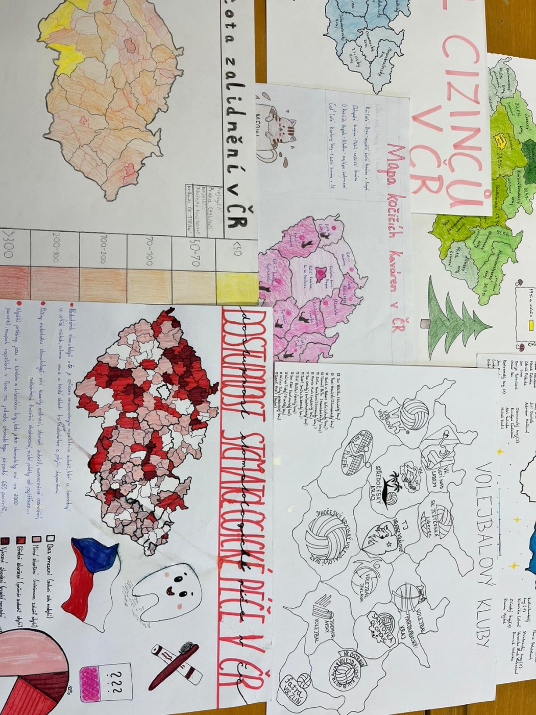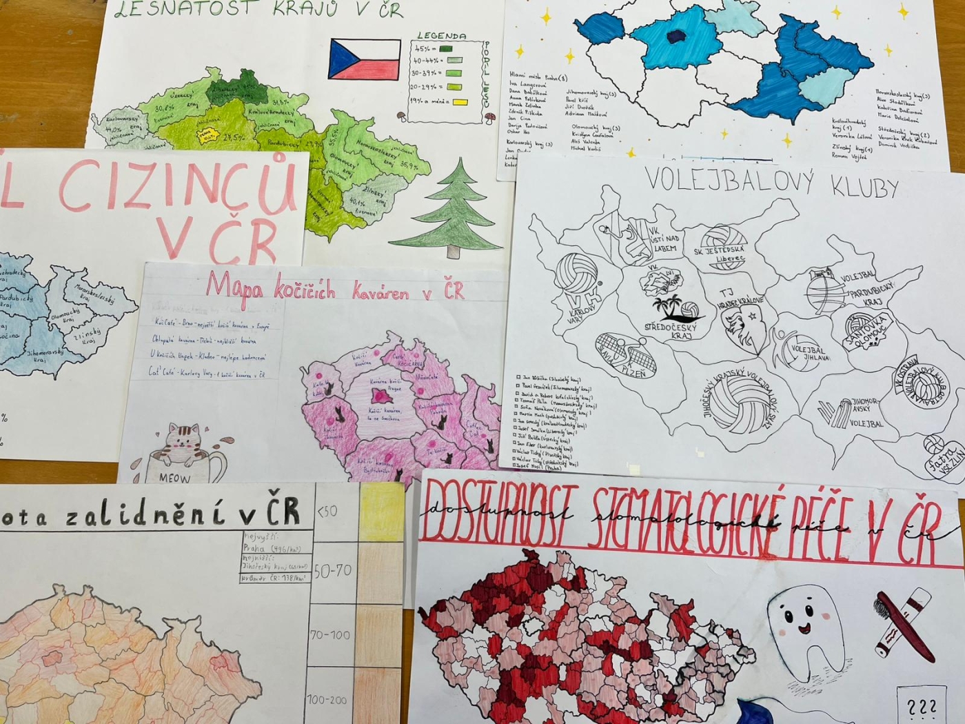 V zeměpisu si často ke klasické výuce vymyslíme menší či větší projekty na aktuálně probíraná témata. Na fotkách jsou vidět práce žáků 9. ročníku. Ti se nyní věnují zeměpisu ČR, když vytvořili tematické mapy ČR s libovolným zadáním nebo plakát, kde představují zajímavosti našeho kraje. Žákům se práce vydařily a v novém roce na ně navážeme s větším „eduscrumovým" projektem.