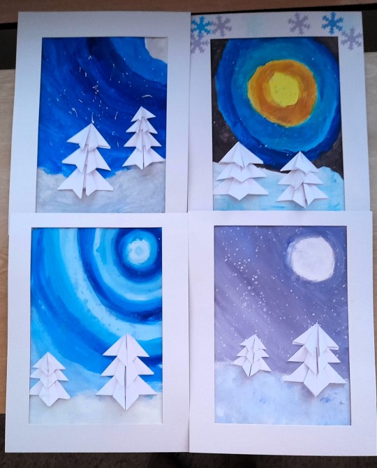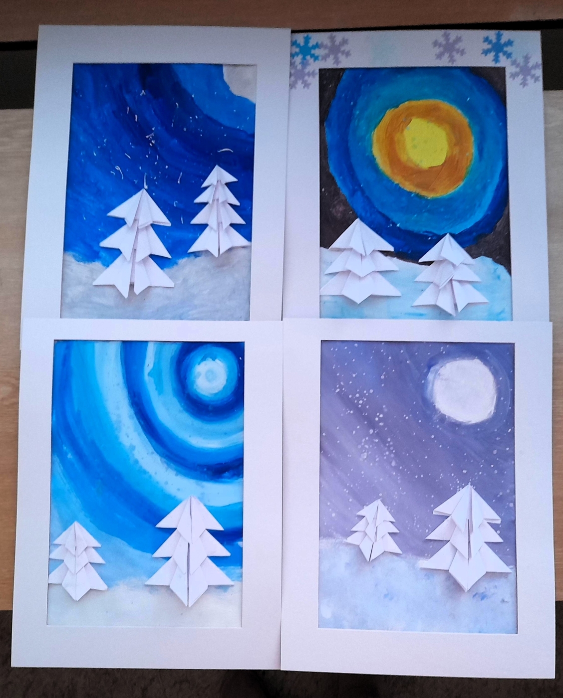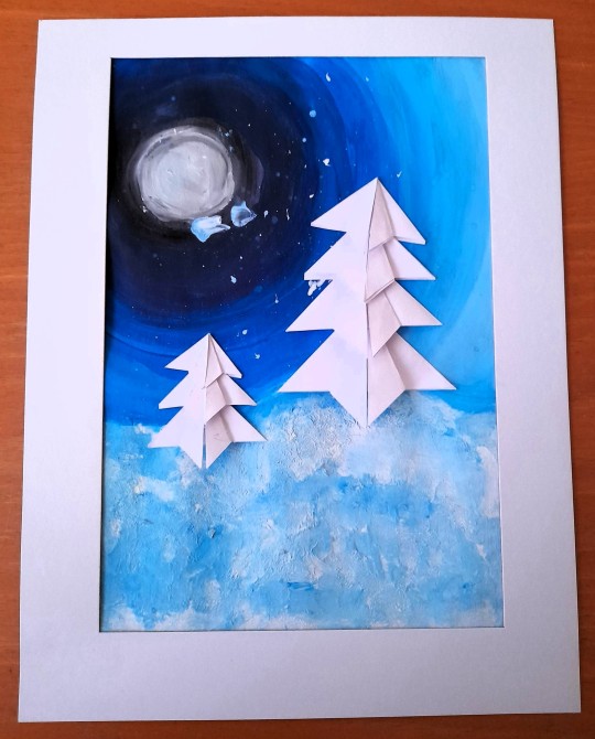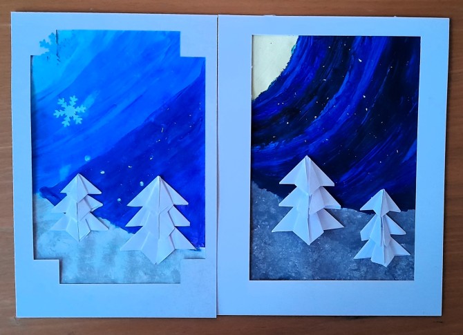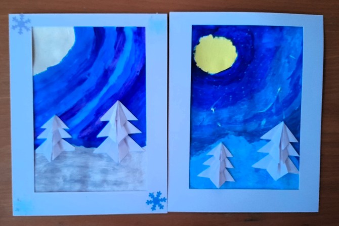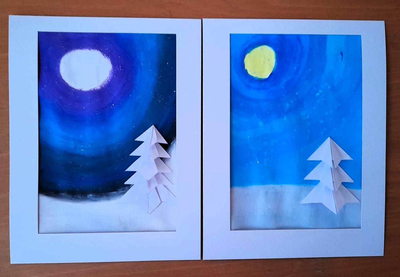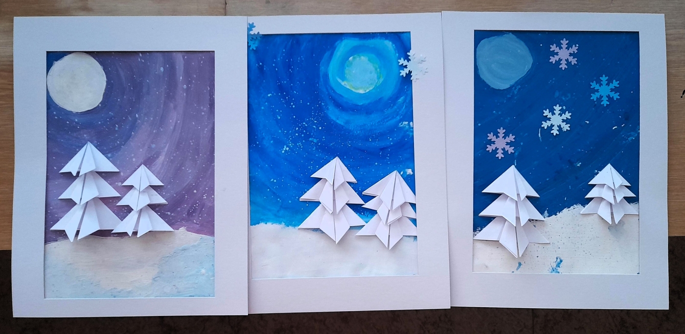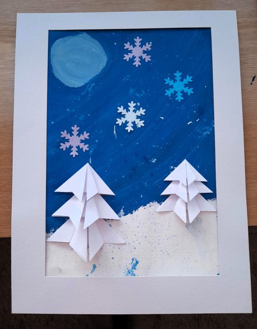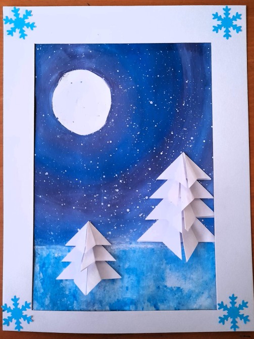 Venku napadl sníh a my se snažíme zachytit zimní krajinu ve výtvarné výchově. Aby to nebylo tak lehké, snažíme se zobrazit noční oblohu. A ta v zimě hraje všemi barvami, především však odstíny modré až do fialova. Ani sníh není úplně bílý a my opět mícháme barvy. Vyzkoušíme si, jak udělat pomocí prstu a štětce, nebo dvou štětců padající sníh. Na stromy zahalené sněhem využíváme origami. Aby byl obrázek dokonalý, využíváme papírový rámeček a možnost dozdobení vločkami. Jako od malíře...