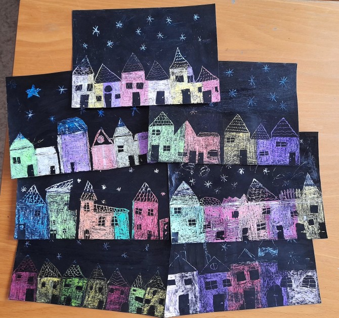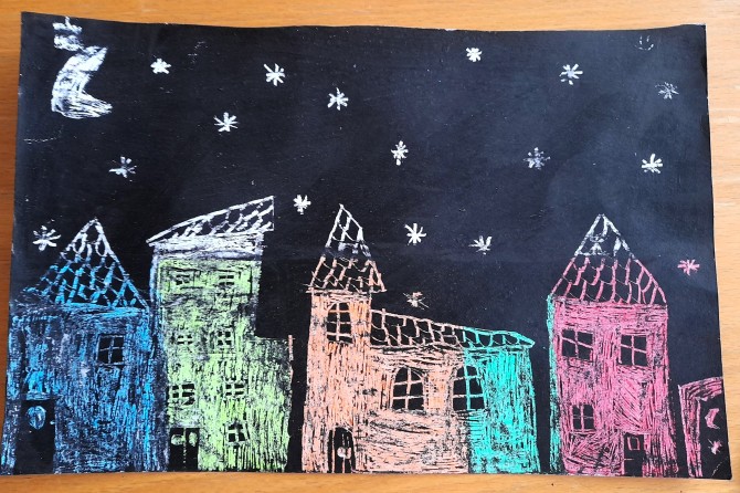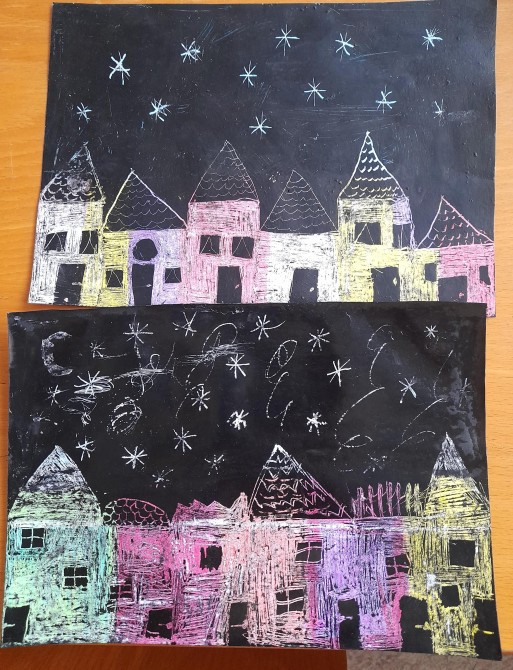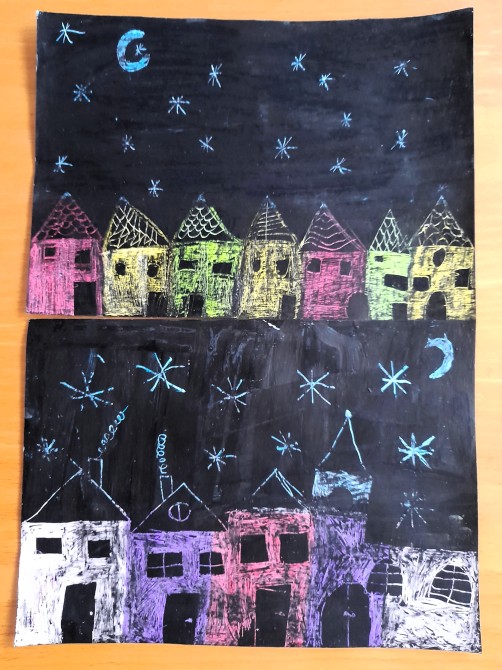 V hodinách výtvarné výchovy jsme se vrátili se žáky 6. ročníku k vyškrabávané technice, kterou jsme využili k zakončení našeho tematického celku Zima. Závěrečnou prací bylo zimní město.