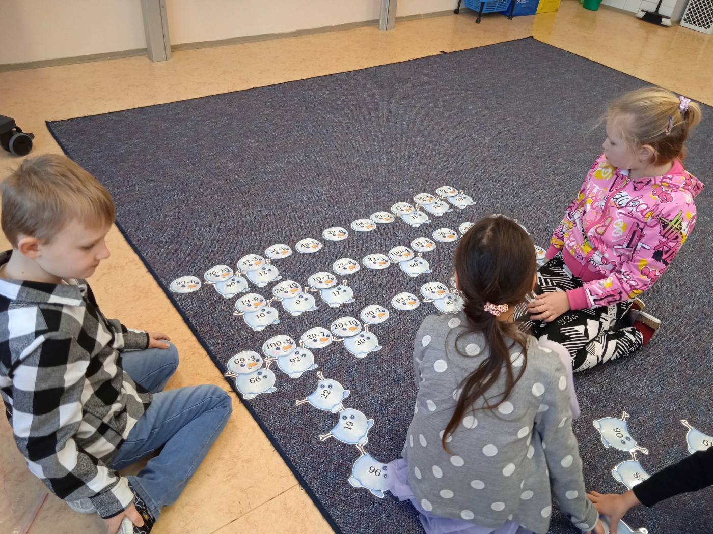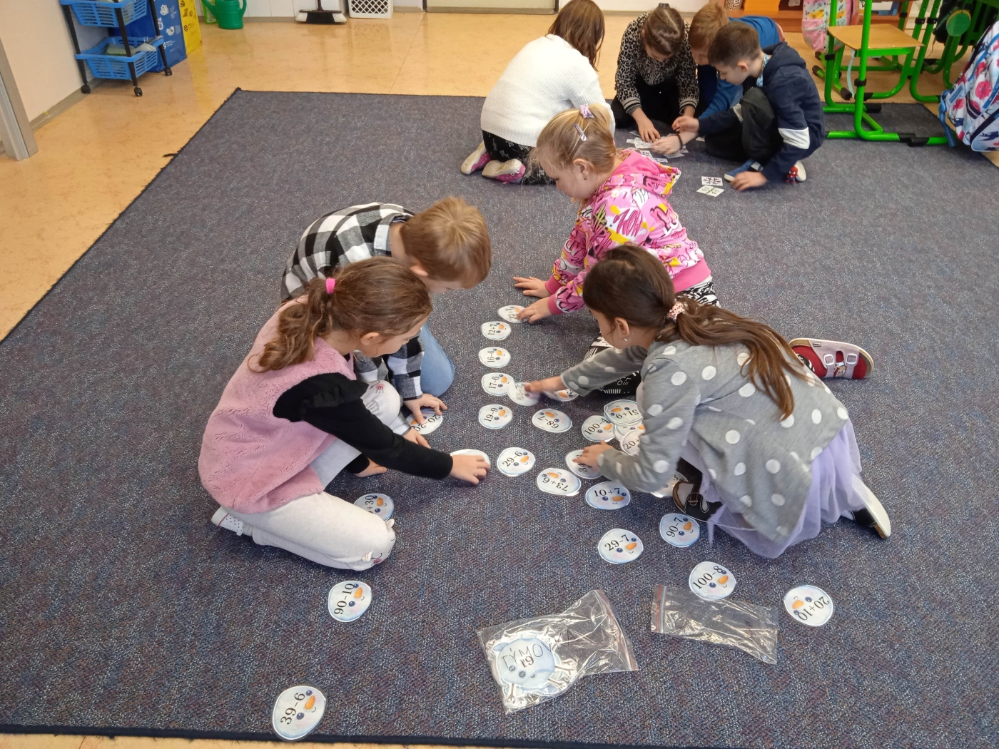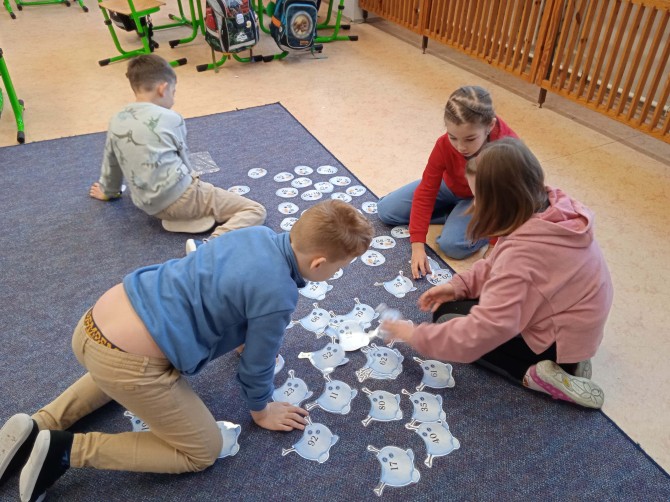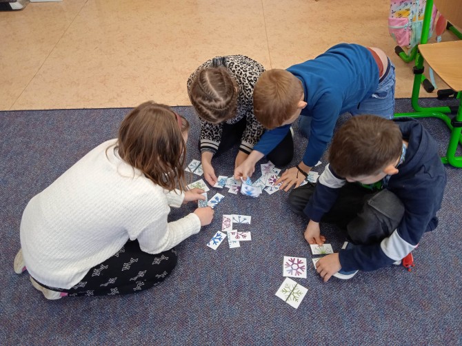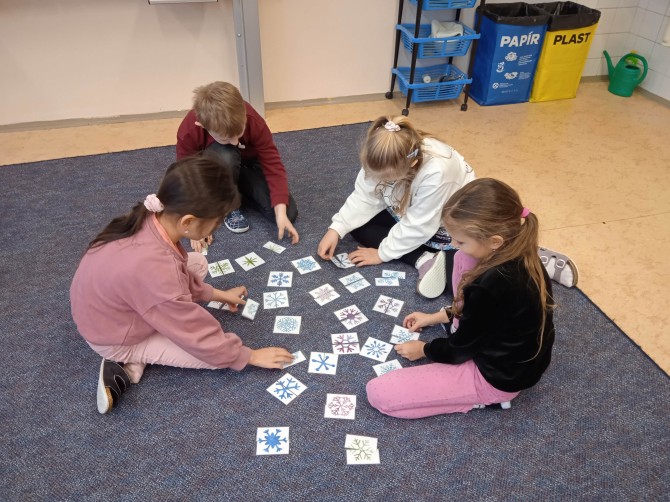 Matematika byla tentokrát velmi pestrá. Děti nejprve společně „stavěly" sněhuláky pomocí příkladů do 100. Počítání si pak každý z nich procvičil samostatně během zimní běhačky. Na závěr se věnovali geometrii a rýsovali krásné sněhové vločky.