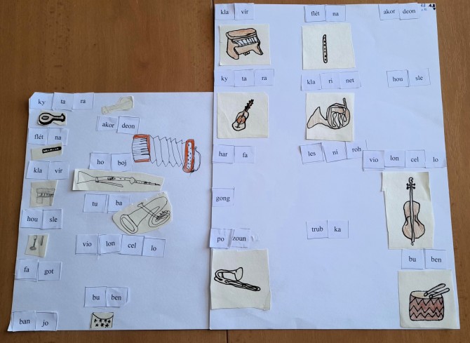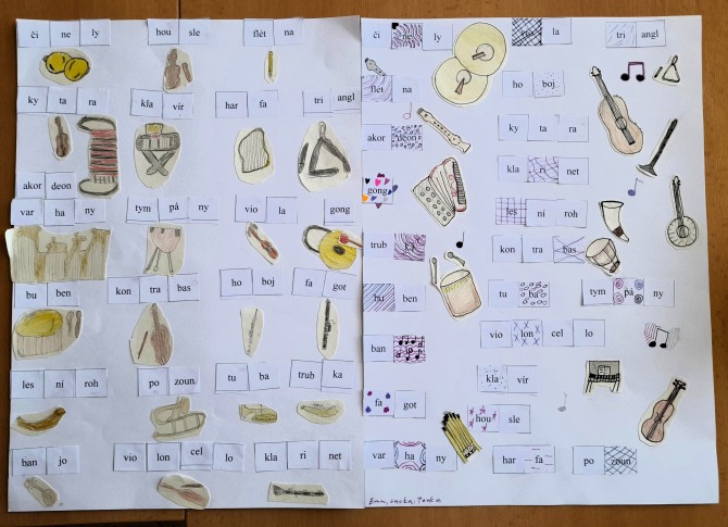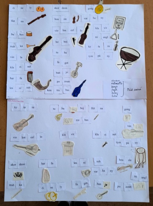 V hodinách hudební výchovy dostali žáci 4. B pracovní list. Na první pohled nedával smysl. Byly zde různé slabiky. Když je ale žáci rozstříhali, zjistili, že z nich mohou poskládat názvy hudebních nástrojů. Některé je napadli hned, nad jinými museli přemýšlet. Jak asi vypadají? Opět to chtělo trošku vzpomínání nebo nápovědy, ale nakonec všichni úkol zdárně splnili.