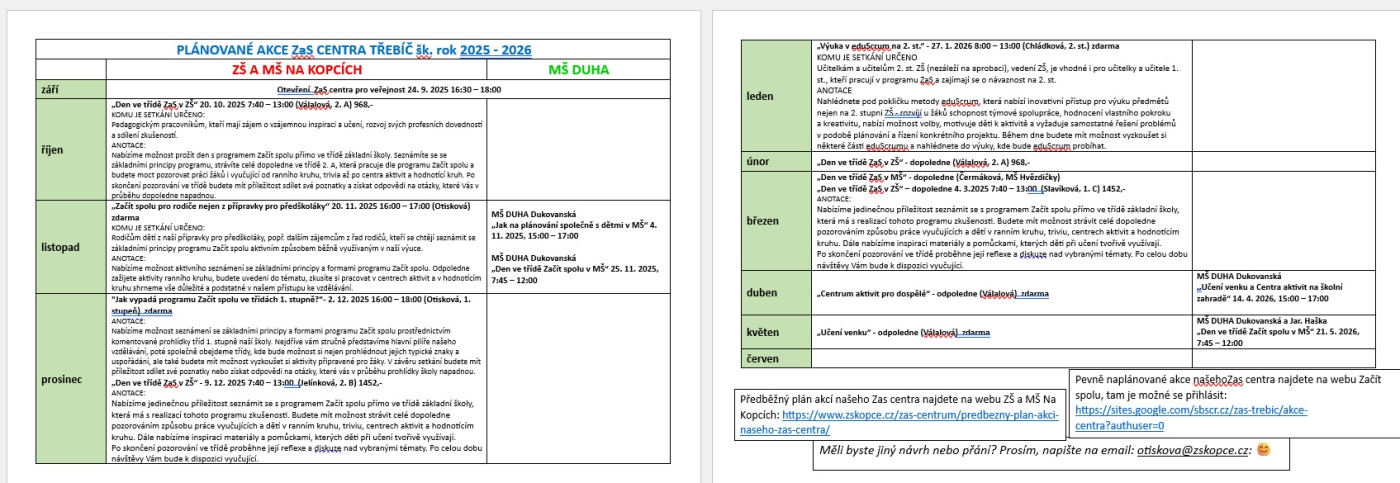 Předběžný plán akcí našeho Zas centra najdete na webu ZŠ a MŠ Na Kopcích:
