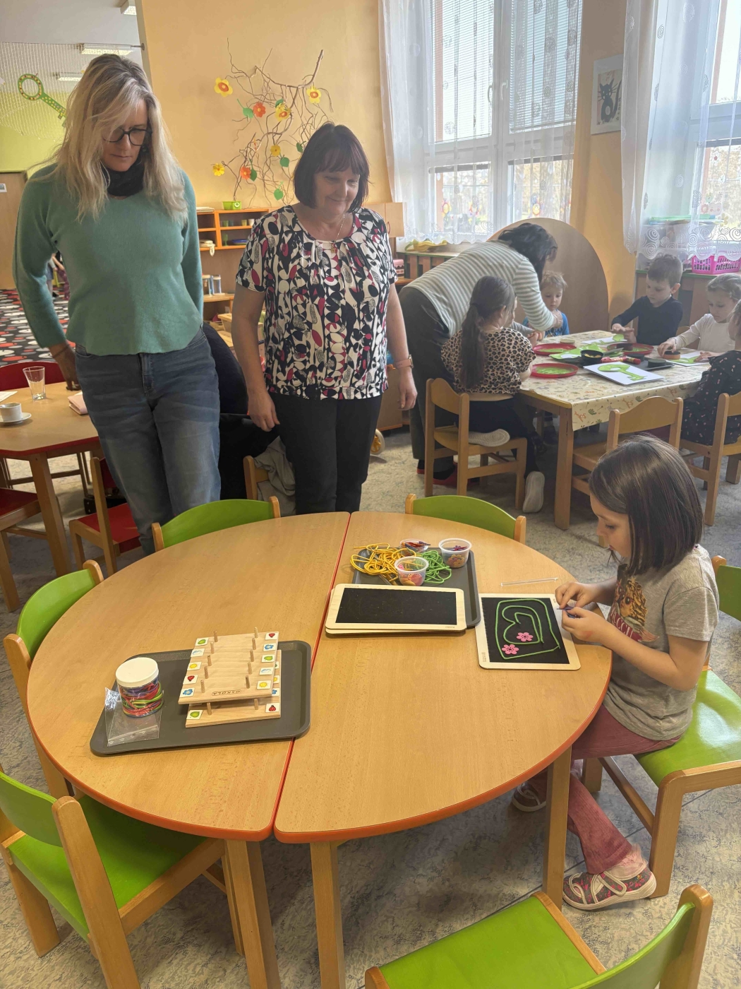 Paní učitelky a ředitelky z blízkých i vzdálenějších školek Kraje Vysočina měly možnost nahlédnout do reálného provozu třídy, vidět práci s dětmi od ranního úkolu přes ranní kruh, centra aktivit a hodnotící kruh. Kromě pozorování přímé a nepřímé práce s dětmi se účastníci mohli inspirovat prostředím obou tříd mateřské školy a jejich pomůckami. Po odchodu dětí na pobyt venku se ještě pedagogové ve třídách zdrželi a doptávali se na vše, co je v souvislosti s jejich předešlým pozorováním napadlo nebo zaujalo. Závěr celé akce se přesunul do prostor školy určeného pro relaxaci našich pedagogů tzv. Café Kopce, kde se mohli občerstvit a pokračovat v diskusi ohledně základních principů programu Začít spolu, jejich konkrétních podoby v průběhu uplynulého dopoledne a všeho, co je zajímalo. Hodnotné pro všechny účastníky i naše pedagogy bylo vzájemné sdílení fungujících postupů ve výuce předškolních dětí.